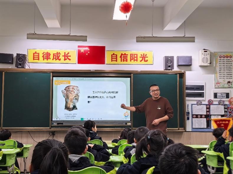 “古人为何把青铜器的眼睛刻画得那么大?”李杨老师的提问,带着孩子们从艺术溯源切入。大家互相观察同桌的眼睛,在探索中发现:眼睛外轮廓是橄榄形,上下眼皮合抱着眼球,眼睫毛长而翘,眼珠上还有灵动的高光……