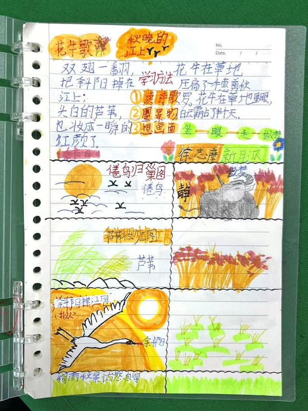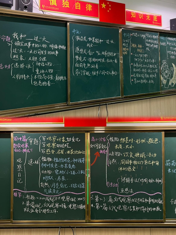 走进四年级的语文教室,最先吸引目光的便是黑板上的板书。它们绝非简单的文字罗列,而是老师们匠心独运的创作:讲解《观潮》时,以浪潮的曲线为脉络,串联起“潮来前、潮来时、潮退后”的叙事层次,生字词、关键词如繁星点缀其间;学习古诗时,用平仄格律的线条勾勒诗境,将意象、情感、背景编织成网,让千年佳句的韵味可视化。色彩的搭配亦颇具巧思,暖色标注核心观点,冷色梳理逻辑脉络,符号与文字相映成趣,既美观醒目,又暗藏章法,为孩子们搭建起清晰的认知框架。